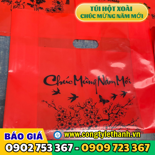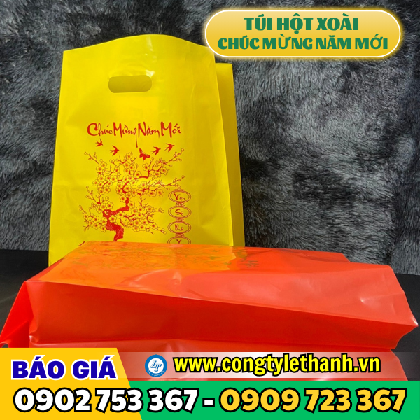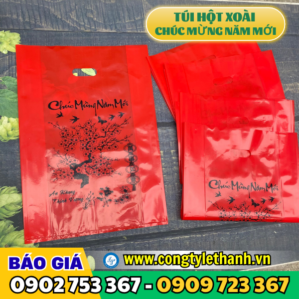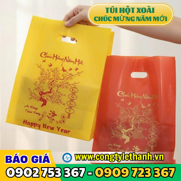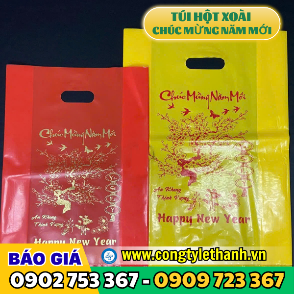Túi hột xoài được làm từ nhựa PE, PP hoặc HD có quai xách đục lỗ tròn như hình hột xoài mang lại sự chắc chắn và thẩm mỹ cao. Túi hột xoài in sẵn chữ “Chúc Mừng Năm Mới” là loại túi thường được sản xuất từ nhựa PE, sau đó được in chữ phủ lên bề mặt (chữ này thường in theo yêu cầu), chữ “Chúc Mừng Năm Mới” như một lời chúc Tết ý nghĩa gửi đến người nhận.